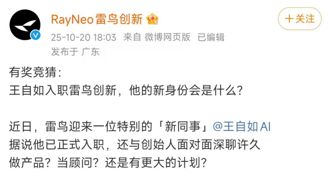 10月20日,雷鸟创新发文表示,近日5策略,王自如已经入职雷鸟。